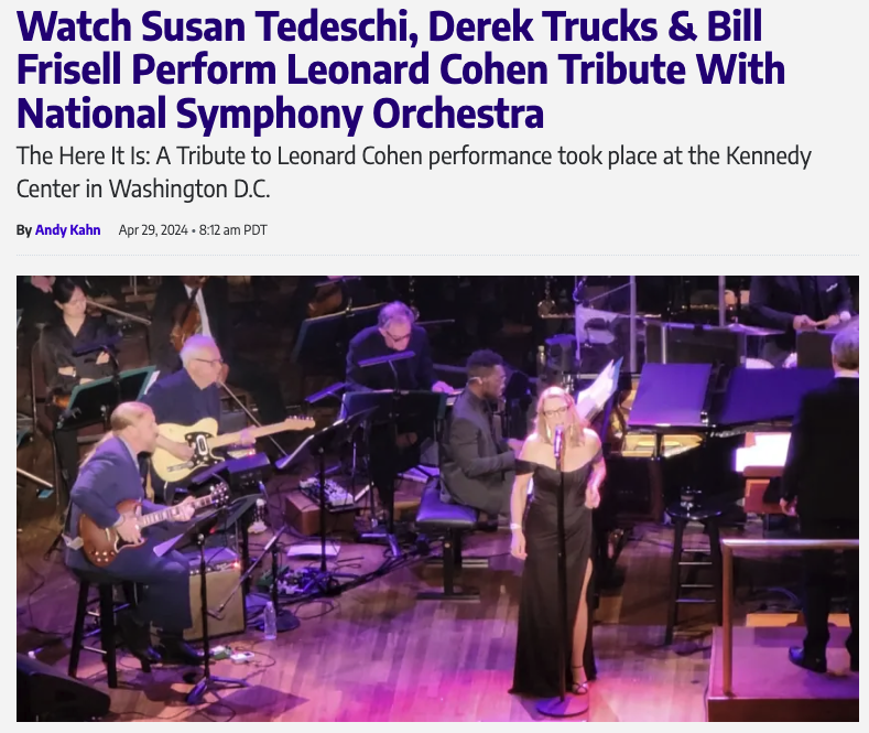 Susan Tedeschi, Derek Trucks and Bill Frisell were among an all-star roster of musicians who joined the National Symphony Orchestra in concert honoring Leonard Cohen. The two-night (Friday, April 26 and Saturday, April 27) Here It Is: A Tribute To Leonard Cohen concert series also saw performances by Madison Cunningham, Ben Folds, Don Henley, Gregory Porter and Trisha Yearwood.